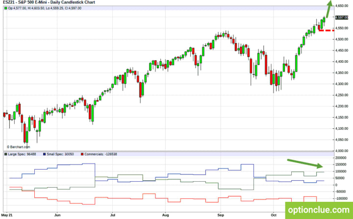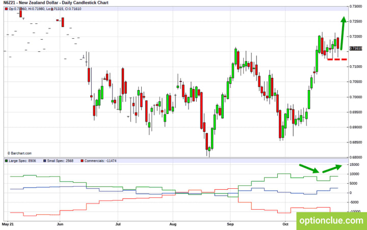 COT indicator increases. At the same time, CFTC reports indicate that large speculators are buying and hedgers are selling and the professionals’ opinion corresponds to the market technical picture.