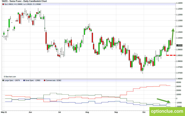 COT indicator decreases. Large speculators are selling franc and the professionals’ opinion doesn’t correspond to the market technical picture and it makes sense to reduce the position size when an entry point appears in the trend direction.