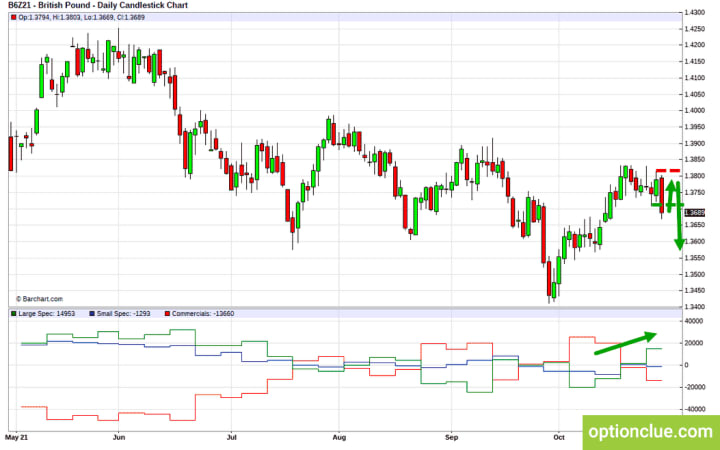 COT indicator increases. Large speculators are buying Euro and the professionals’ opinion doesn’t correspond to the market technical picture and it makes sense to reduce the position size when an entry point appears in the trend direction.
