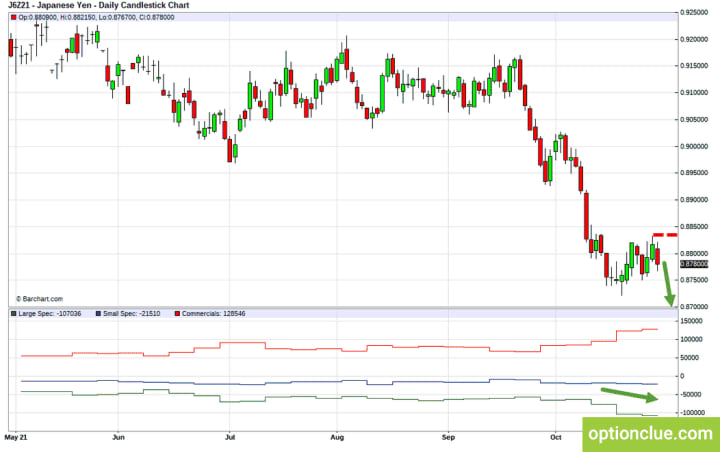 COT indicator decreases. Large speculators are selling Yen and the professionals’ opinion corresponds to the Daily trend direction.