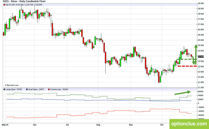 COT indicator increases. Large speculators are buying gold and the professionals’ opinion corresponds to the market technical picture.
