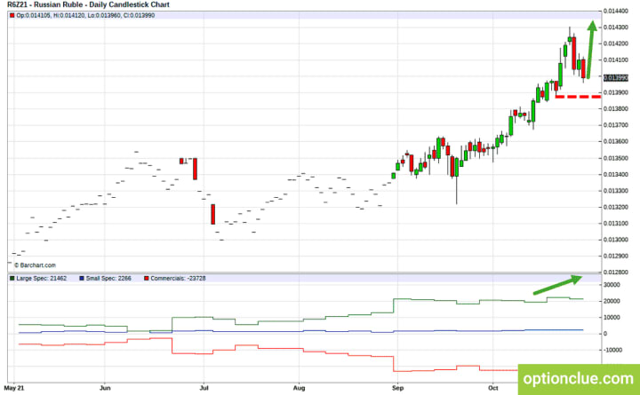 COT indicator decreased but didn’t reverse. Large speculators are buying rouble and the professionals’ opinion corresponds to the Daily trend direction.