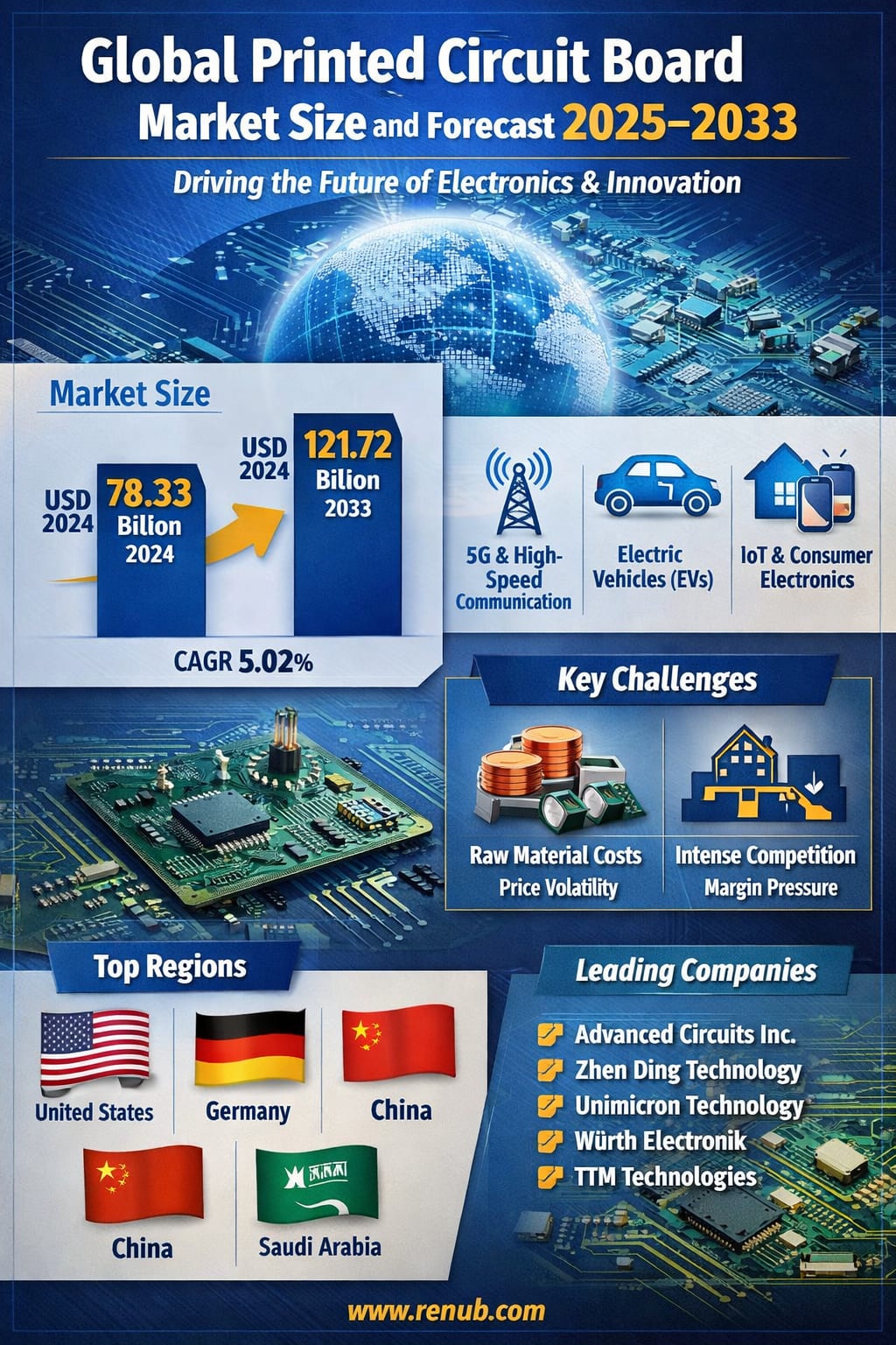 The Global Printed Circuit Board (PCB) Market was valued at USD 78.33 billion in 2024 and is projected to reach USD 121.72 billion by 2033, growing at a compound annual growth rate (CAGR) of 5.02% over the forecast period. This steady expansion reflects the unstoppable growth of electronics across industries such as consumer devices, automotive, healthcare, telecommunications, and industrial automation.
