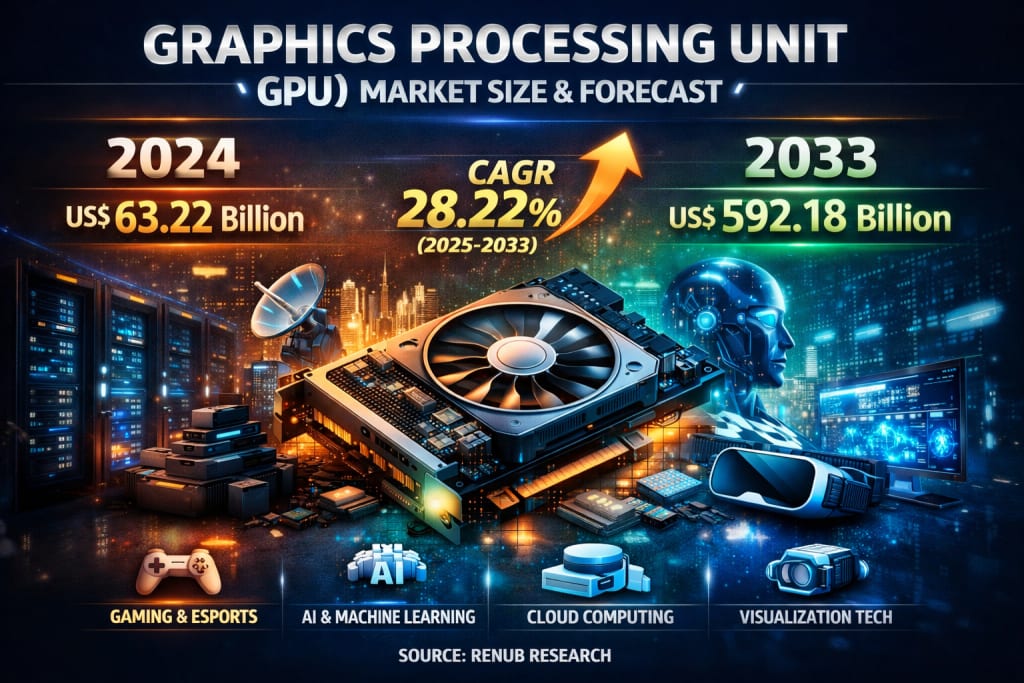 According to Renub Research’s latest industry analysis, the Global Graphics Processing Unit (GPU) Market is expected to surge from US$ 63.22 billion in 2024 to US$ 592.18 billion by 2033, growing at an impressive compound annual growth rate (CAGR) of 28.22% from 2025 to 2033. This extraordinary expansion reflects not just rising consumer demand for better graphics, but also the central role GPUs now play in artificial intelligence (AI), machine learning (ML), data centers, cloud platforms, and high-performance computing (HPC).
