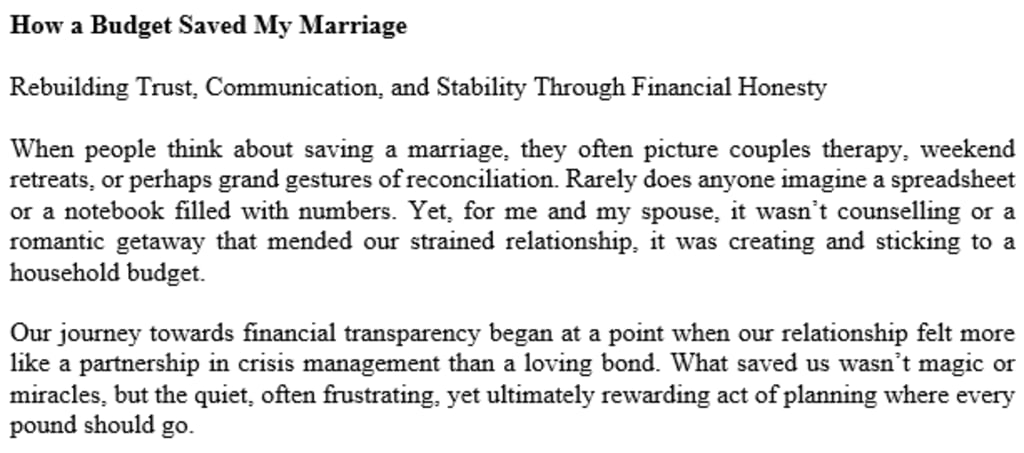 The turning point came on a rainy Saturday afternoon. A direct debit had bounced for the third month in a row, triggering another penalty fee. That small incident unravelled a much deeper issue. We had a shouting match in the kitchen, fuelled by frustration and mutual disappointment and I remember saying, “We can't keep doing this.” It wasn’t just about the money. It was about feeling unheard, unsupported, and overwhelmed.