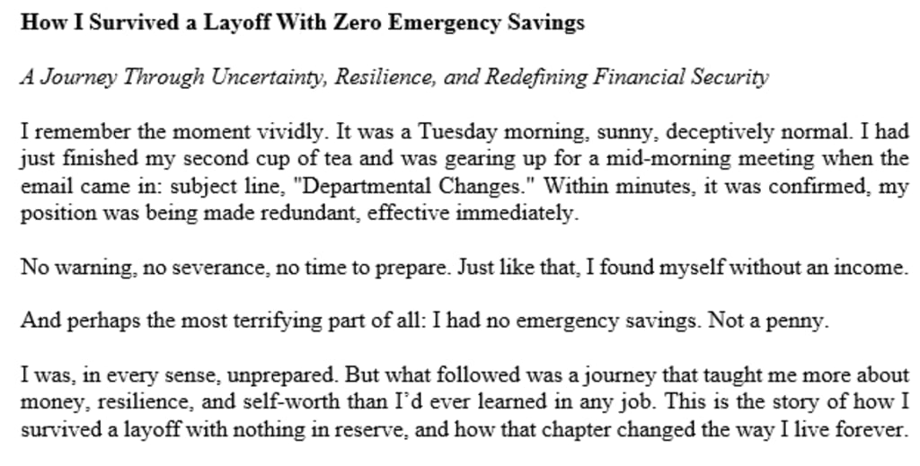 I was, in every sense, unprepared. But what followed was a journey that taught me more about money, resilience, and self-worth than I’d ever learned in any job. This is the story of how I survived a layoff with nothing in reserve, and how that chapter changed the way I live forever.