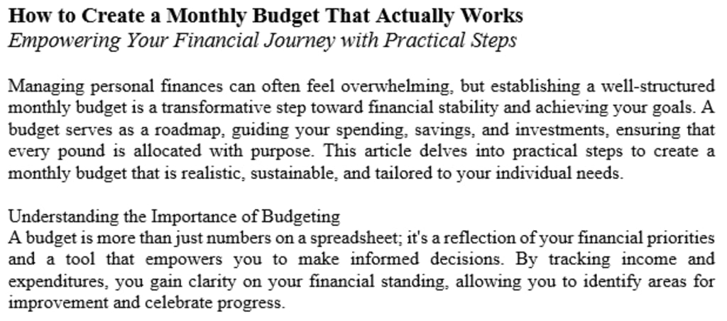 Creating a monthly budget that truly works requires commitment, honesty, and flexibility. By understanding your financial landscape, setting clear goals, and choosing a budgeting method that resonates with you, you lay the foundation for a secure and prosperous financial future. Remember, a budget is not a constraint but a tool that empowers you to make intentional choices, bringing you closer to your aspirations. Embrace the journey, and take control of your financial destiny.