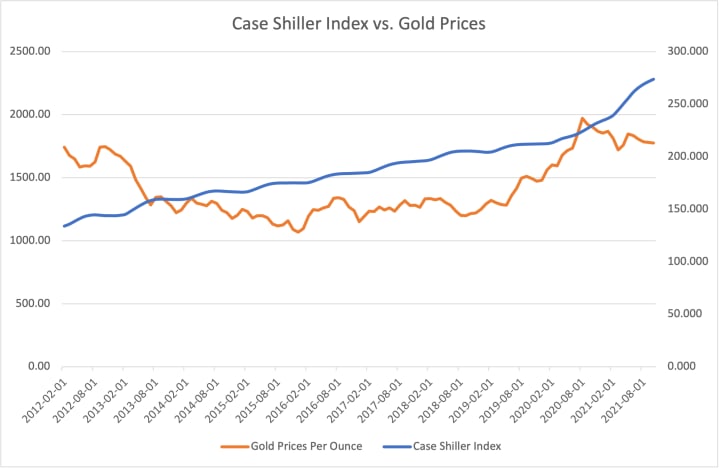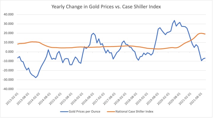 Using this same line of reasoning, it would make sense for homeowners/prospective homebuyers to consider looking for assets that sport a negative correlation with U.S. housing prices. After reviewing various assets classes, we find that gold prices feature this exciting characteristic. From the 1980s to the present, we find that the yearly changes in the CS-HPI and gold prices generated an outsized -.23% correlation!