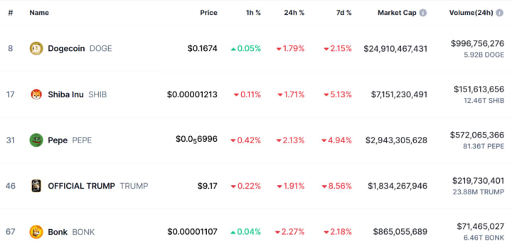 The major memecoins remain relatively stable. Source: CoinMarketCap