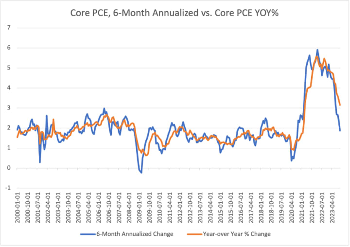Of course, Fed critics will say that the central bank targets the 12-month growth rate, not the 6-month annualized growth rate. Nonetheless, a statistical regression of the yearly core PCE growth rate against the 6-month annualized growth rate reveals that the latter growth rate explained 85% of the movements in the 12-month growth rate. Such evidence suggests that the Fed’s jet is positioning itself to land on the runway and begin preparing to roll out its “Mission Accomplished” banner.