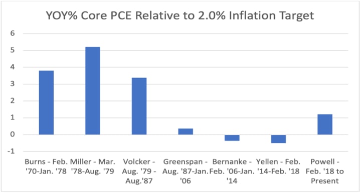 Interestingly, Paul Volcker, who gets lots of credit for his inflation-fighting credentials, averaged a core PCE figure that exceeded the Fed’s benchmark target by 327 basis points or more than twice Chair Powell’s overshooting margin! Arthur Burns, often described as a Fed Chair who failed miserably to control inflation, exceeded the 2.0% target by 381 basis points. Still, Burn’s disappointing performance was exceeded by G.W. Miller during his short tenure, who surpassed the Fed’s inflation target by a whopping 521 basis points!