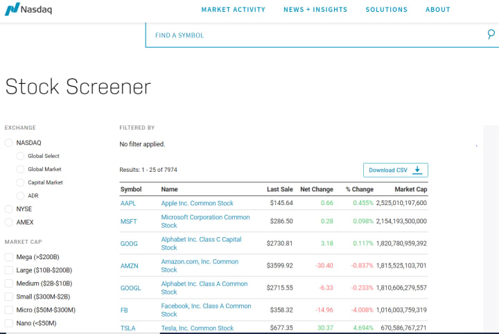 Alpaca premium subscription talks about how it provides unlimited data, which holds, but it is restricted. I tested how many symbols I can subscribe to Alpaca with one request. I gathered all Nasdaq symbols using the Nasdaq Screener tool. You can find the tool here.