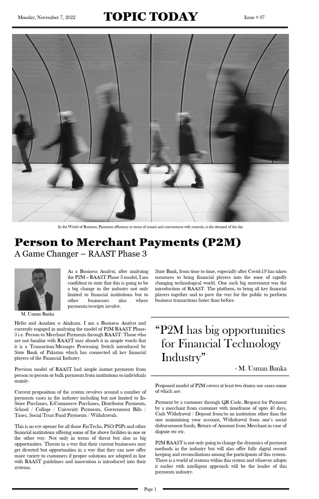 As a Business Analyst, after analyzing the P2M – RAAST Phase 3 model, I am confident to state that this is going to be a big change in the industry not only limited to financial institutions but to other businesses also where payments/receipts involve.