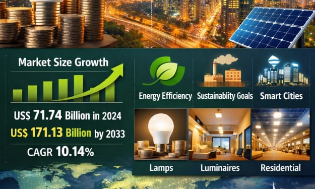 Global LED Lighting Market Overview The global LED lighting market is undergoing a powerful transformation, driven by the world’s accelerating shift toward energy efficiency, sustainability, and smart infrastructure. According to Renub Research, the LED Lighting Market is expected to grow from US$ 71.74 billion in 2024 to US$ 171.13 billion by 2033, registering a strong CAGR of 10.14% from 2025 to 2033. This impressive growth highlights how light-emitting diode (LED) technology has moved far beyond being a niche alternative and has become the global standard for modern lighting.