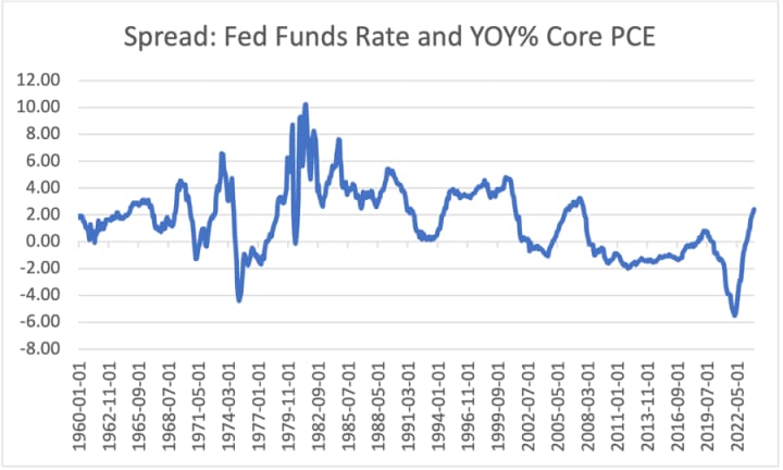 It should come as no surprise that the spread between the federal funds rate and the 6-month annualized growth rate in core PCE is now more than double its historical average. A similar result is generated using the spread between the federal funds rate and the 3-month annualized core PCE growth rate!