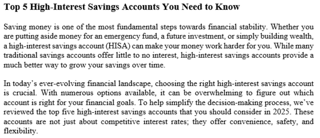 Now that we’ve covered the basics, let’s explore the top five high-interest savings accounts for 2025. These accounts stand out not only because of their interest rates but also due to their flexibility, accessibility, and overall value.