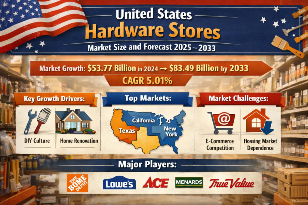 According to Renub Research’s latest market assessment, the United States Hardware Stores Market is projected to grow from US$ 53.77 billion in 2024 to US$ 83.49 billion by 2033, registering a compound annual growth rate (CAGR) of 5.01% from 2025 to 2033. This steady expansion reflects the continued importance of hardware retailers in supporting construction, home renovation, maintenance, and the rapidly growing do-it-yourself (DIY) culture across the country.