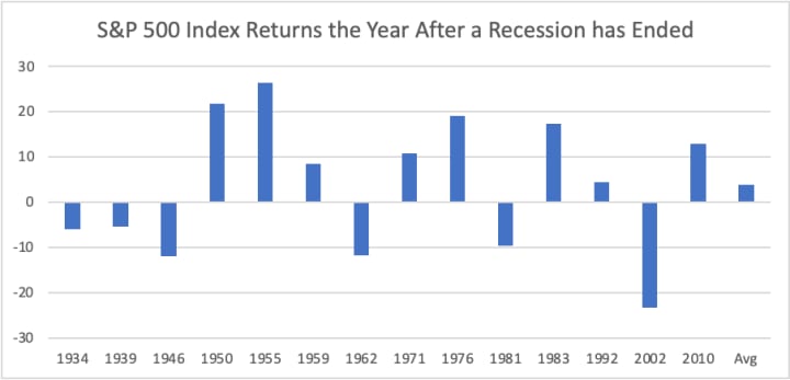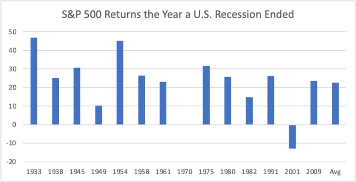 Still, history reveals that when recessions come to an end, equity markets tend to recover like a coiled spring! By way of example, the S&P 500 index has risen by an average of 22.6% during the year a recession has ended followed by a more moderate average gain of 3.8% during the year after a recession has ended. However, when the S&P 500 generates a return below this outsized 22.6% (during the year when a recession ends), the equity market has often outperformed, its long-term annual historical average (from 1928-2019) of 7.7% during the following year.
