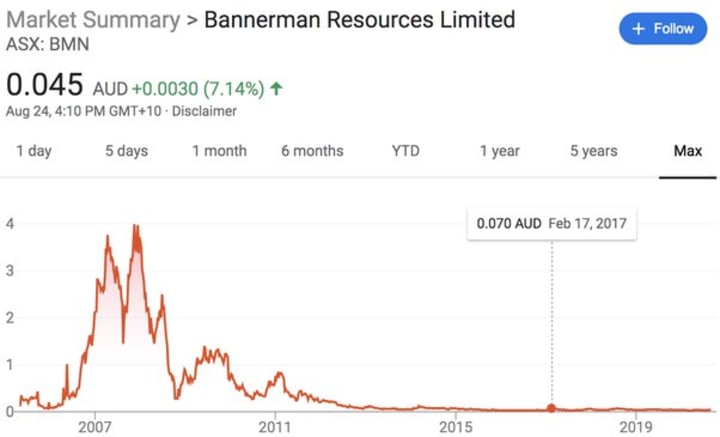 I thought I was going to miss out on the uranium bull market a few years ago, so I spent all of my money on shares in a uranium developer company (Bannerman Resources), which averaged 0.06 AUD.