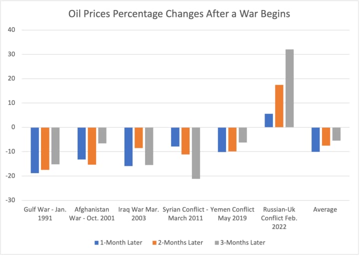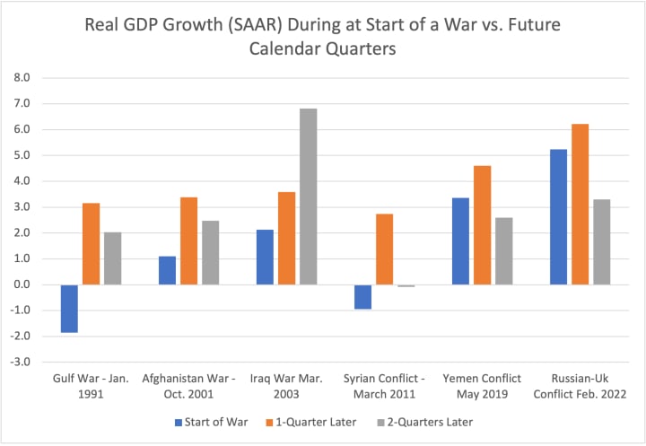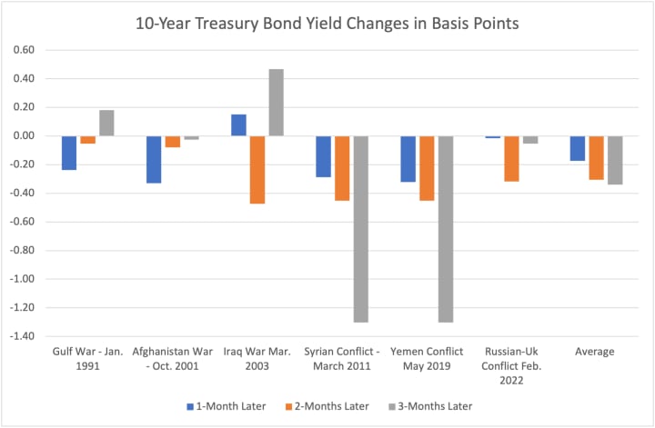 Our analysis suggests that the most significant impact of military conflicts is the human toil that it extracts from both sides. The effect on the bond market is to lower long-term interest rates as the “safety haven” effect springs into action. Oil price movements tend to reflect the behavior of oil-exporting countries, given that the global oil market is less than competitive.