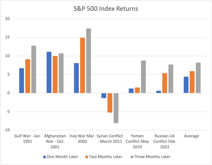 The U.S. economy tends to be boosted by higher military spending, often associated with taking sides in the conflict, which supports economic growth. The combination of these factors, with few exceptions, has historically supported U.S. equity prices.