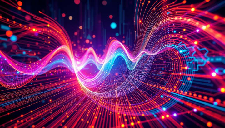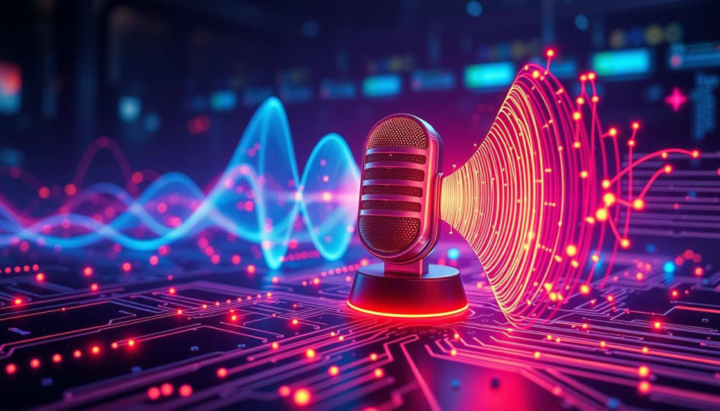 "Futuristic AI voice technology concept, sleek soundwave patterns emanating from a sophisticated device, vibrant colors representing data flow, abstract shapes illustrating interaction between users and the technology, glowing circuitry elements, a high-tech atmosphere conveying innovation and connectivity."