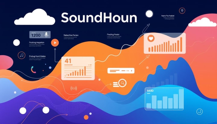 "Abstract illustration of a digital market landscape for SoundHound, featuring graphs and charts depicting growth trends, technology integration, and user engagement metrics. Incorporate elements like sound waves and AI motifs to emphasize innovation and market positioning, with a futuristic color palette."