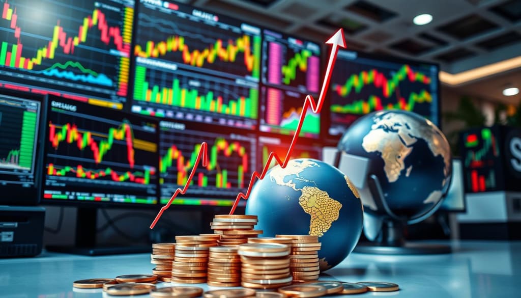 A dynamic stock market analysis scene featuring a modern financial workspace with multiple screens displaying colorful charts and graphs, a bullish trend line rising sharply, stacks of digital currency in the foreground, and a globe illustrating global markets in the background, all with a bright and energetic atmosphere.