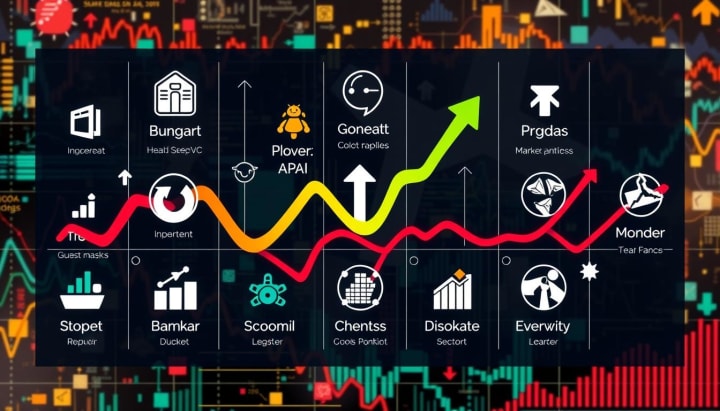 A vibrant, visually engaging infographic showcasing a diverse array of stock market sectors, each represented by distinct symbols and colors, with upward and downward arrows indicating trends, layered over a dynamic background of abstract financial graphs and charts, evoking a sense of analysis and insight into current market leaders.