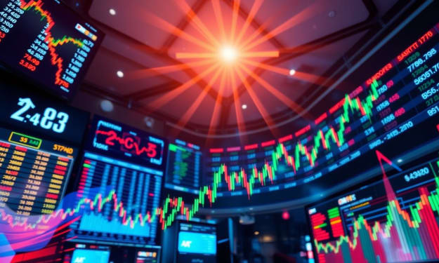 A bustling stock exchange floor, with traders intensely analyzing screens filled with colorful graphs and numbers, a large digital display showing fluctuating stock prices, the atmosphere charged with energy, sleek modern architecture in the background, diverse group of people in business attire, bright lights reflecting off polished surfaces.