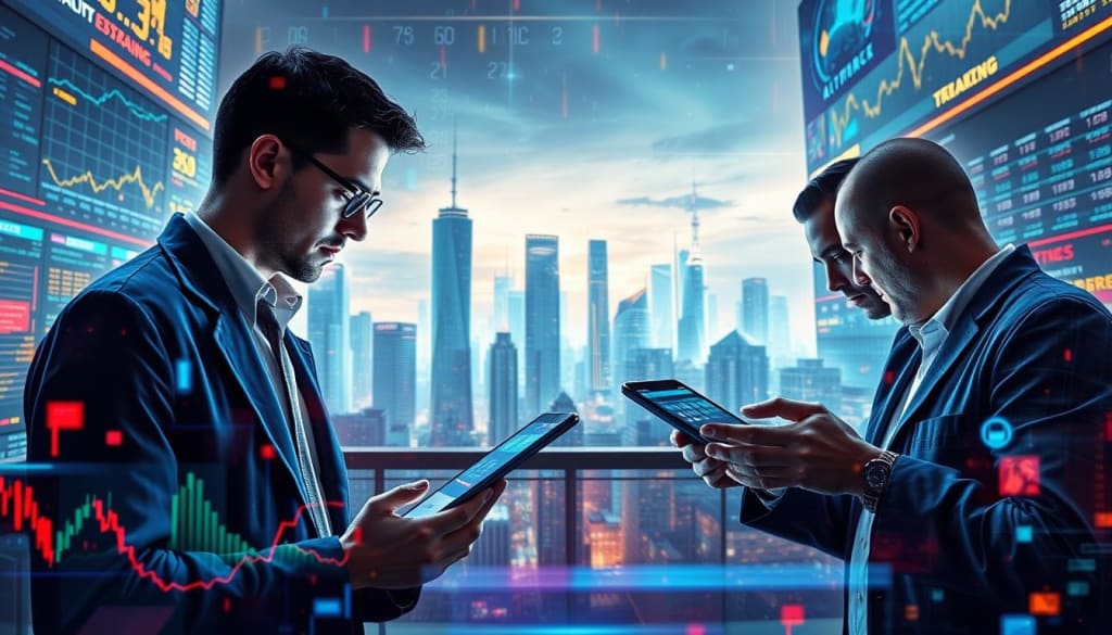 A dynamic and abstract representation of stock trading, featuring a futuristic city skyline with glowing digital graphs and charts, traders analyzing information on sleek devices, vibrant colors illustrating market fluctuations, and an atmosphere of energy and urgency in a high-tech financial environment.
