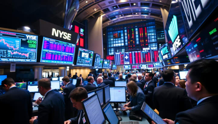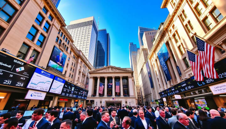 A bustling scene of the New York Stock Exchange, with iconic buildings and busy traders in suits, stock tickers displaying market data, digital screens showing trends and graphs, a diverse group of people engaged in trading activities, vibrant energy reflecting the dynamic nature of the financial markets, bright lights and a clear blue sky above.