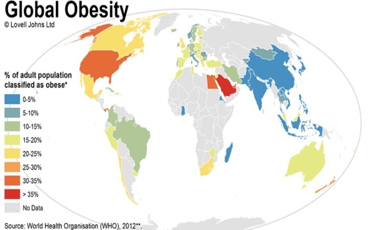 The global map presented above represents an average of the adult population classified as obese. Surprisingly for some, the USA and the UK are not in the mighty glowing red colour. If we look back in time, it would have been much different. The difference? The sports schemes carried on in schools since grass roots levels.