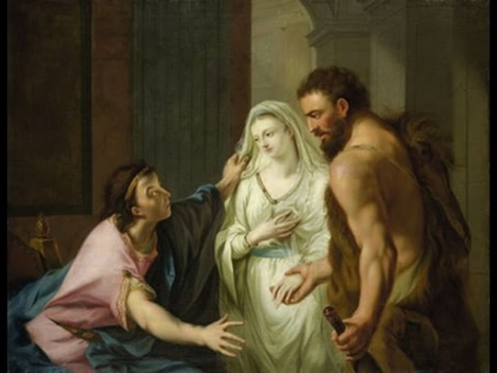 Admetus, according to myth, was punished because he forgot to offer the appropriate sacrifices to Artemis on his wedding day. Apollo, indebted to him, granted him the alternative of having someone else die in his place. The origin of the tragedy ties into a broader pattern of patriarchal negligence.