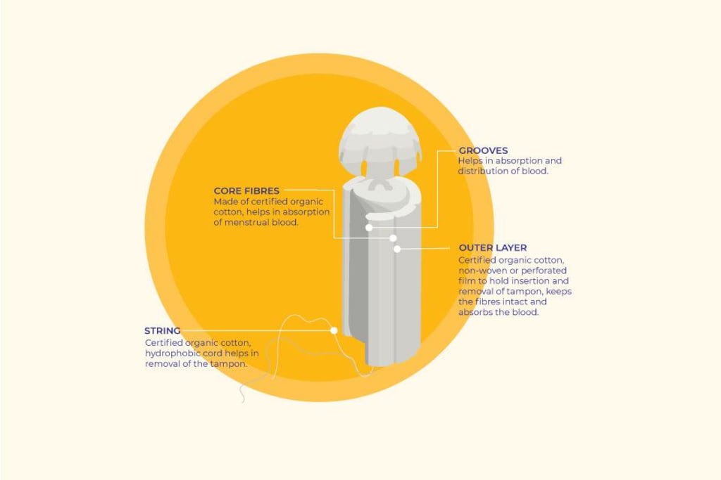 Simply put, a tampon is a menstrual hygiene product that is cylindrical in shape, is made of cotton and is designed to absorb menstrual flow inside your vagina. This diagram breaks down tampons to explain what they are.