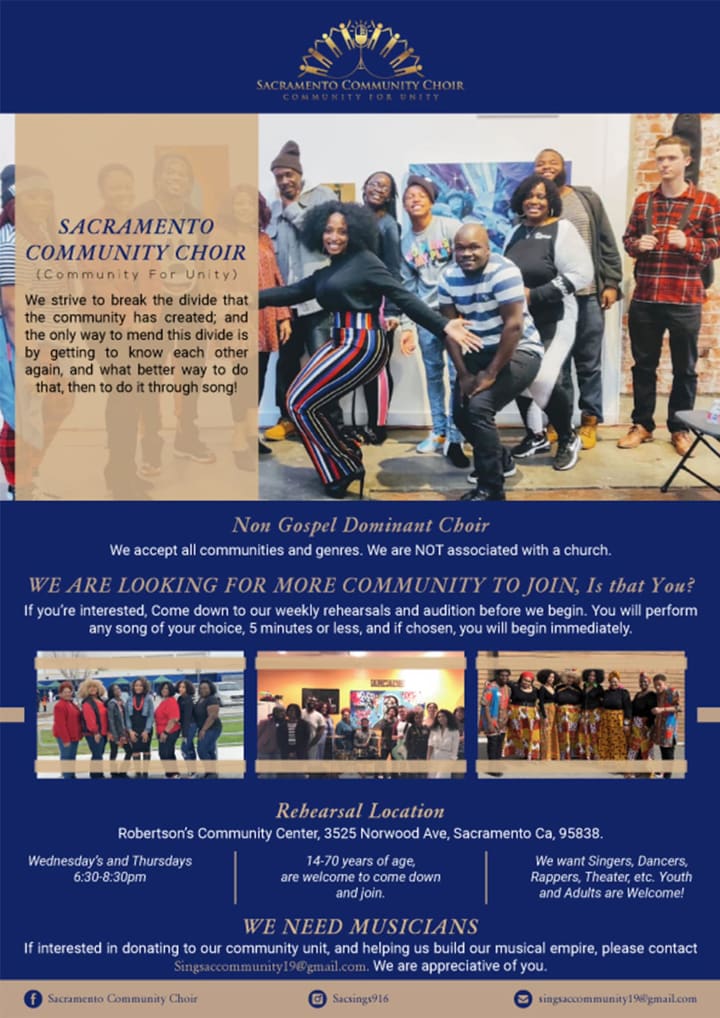 I am impressed with the Sacramento Community Choir Leader/Director title you hold and the effortless attention you give to your members. It is a true blessing to help these singers as to how you advance them in their development of the art.
