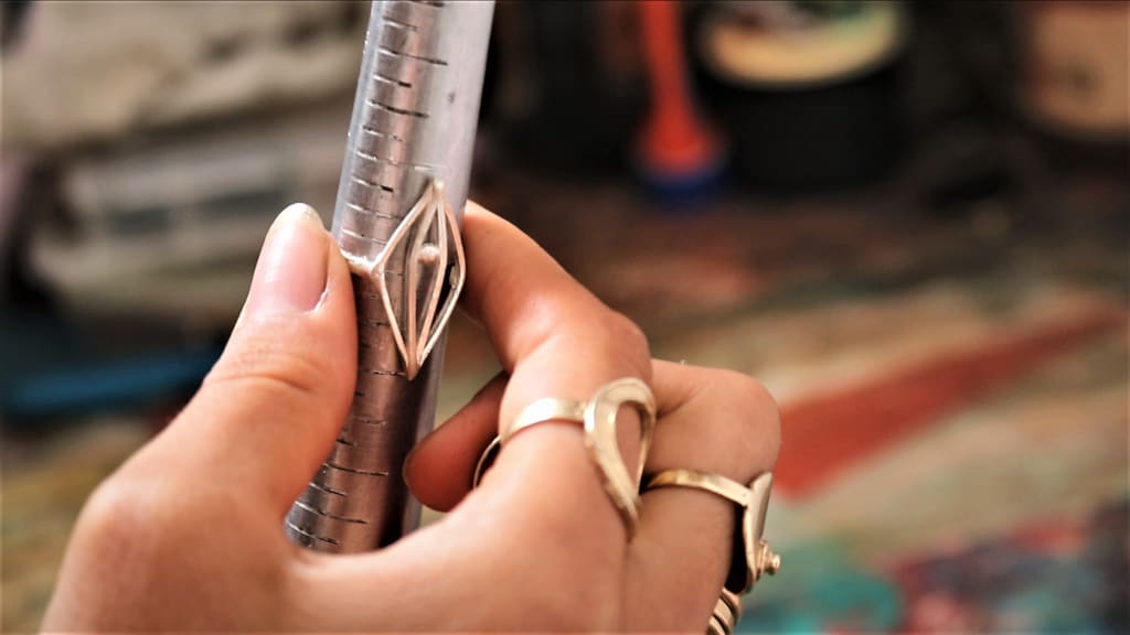 A simple sleeveless dress reveals intricate monochromatic tattoos sketched onto her bare skin. Dazzling accessories dangle from her ears and lay on her chest. But it’s the rings on her fingers that are puzzling. Beautiful, yet some might say, crude. Shiny grey rings – shaped into a vulva.