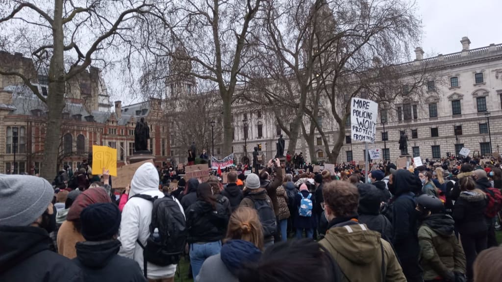 - A protest is held outside Scotland Yard and at Parliament Square for the disgusting treatment of the women protestors last night and to protest the Police, Crime, Sentencing and Courts Bill going to Parliament on Monday.