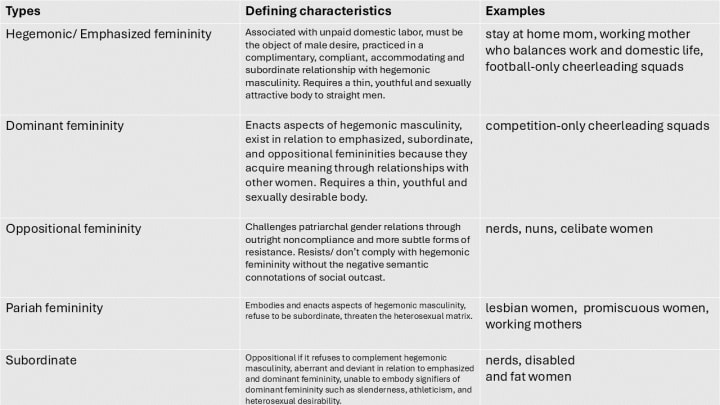 Charlebois (2010) quotes Connell’s (1987) concept of emphasized femininity and not hegemonic femininity as calling it that would not adequately capture the power dynamics between the genders, that is, the domination of men over women. The existence of hegemonic masculinity when embodied by some men is the reason as to why we legitimize the patriarchy and the overall subordination of women to men (Schippers, 2007). According to Connell (1987), femininity can never be hegemonic because it exists in constant subordination to masculinity. Thus, emphasized femininity is “practiced in a complimentary, compliant, and accommodating subordinate relationship with hegemonic masculinity” (Charlebois, 2010, p.26). Both hegemonic masculinity and emphasized femininity exist in a hierarchical relationship with other gender performances, the latter especially in relation with non-empahsized and therefore subordinate femininities (Charlebois, 2010). While hegemonic masculinity desires the feminine object, emphasized femininity must be the object of male desire and exists to be the subordinate of hegemonic masculinity (Charlebois, 2010). Schippers (2007) views femininities as existing in a hierarchy of their own in a state of subordination to hegemonic masculinity. Dominant femininities are described as “the most powerful and/or the most widespread type in the sense of being the most celebrated, common, or current form of femininity in a particular social setting” (Charlebois, 2010, p.27), Charlebois giving the example of competition-only high school cheerleaders saying that they embody a sought after feminine ideal but they are not emphasized as they do not exist to support the expansion of hegemonic masculinity, and in the case where some of these female athletes take their career and athleticism very seriously, they are challenging the mainstream belief that high level sports are not a field made for women.