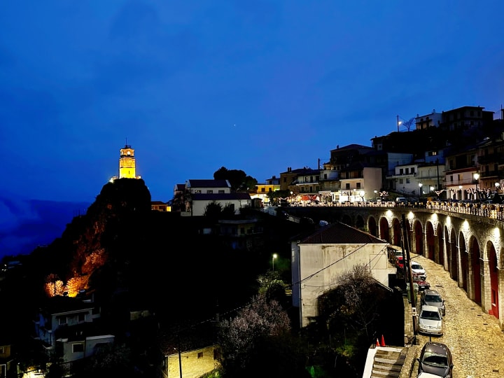 Visitors can find shops with local produce, art, and restaurants along the main drag. It's where I found a pound of giant beans I purchased and brought home to make Gigantes Plaki (Giant Beans)! However, if you want to enjoy the ambiance of Arachova, I recommend walking along the sidewalk to see the sunset behind the clock tower.
