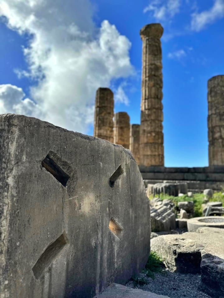 Visitors may recognize Tholos, a circular building dedicated to the goddess Athena (down the hill and on the other side of the road).