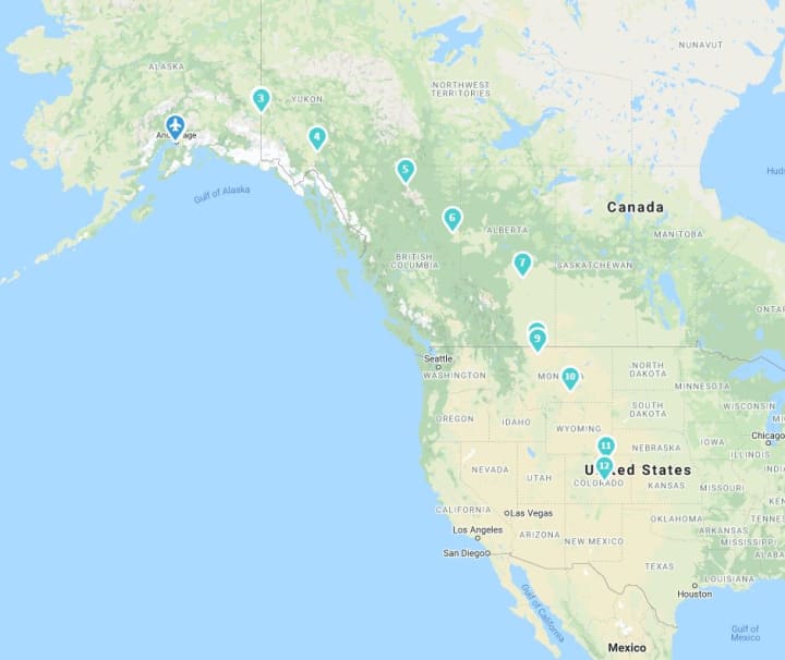 It’s going to take us one day to get from Anchorage to the border of Canada. Then, it will take us about two days to get through each territory, and another two to three days to get to Colorado Springs.