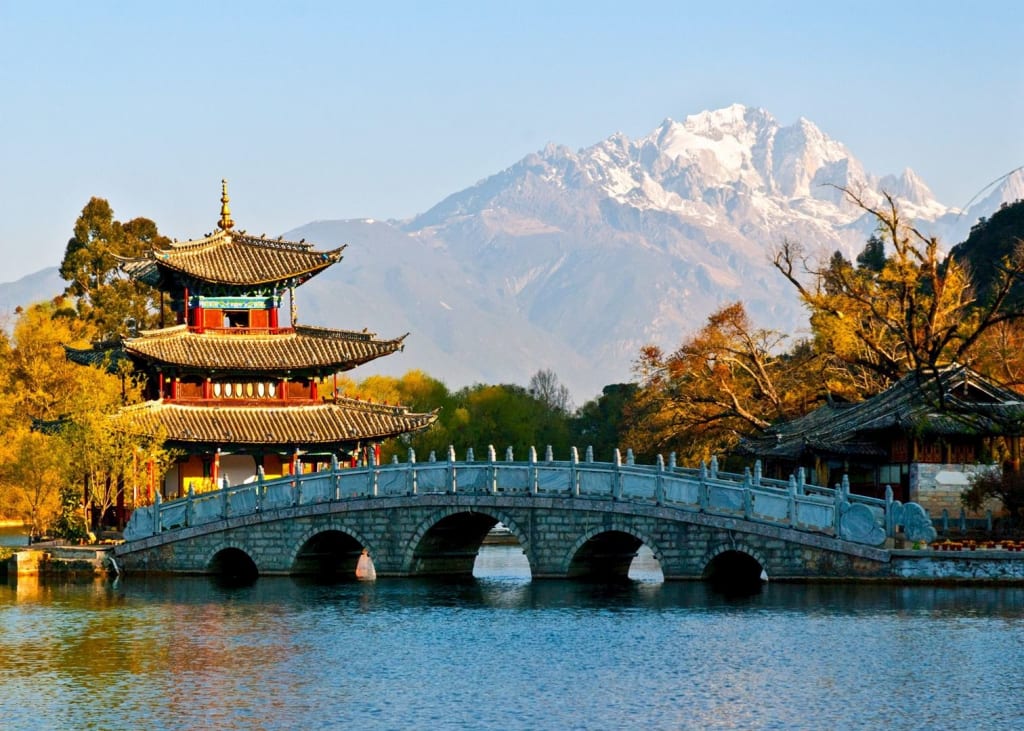 Jade Spring Park offers visitors lovely scenery along with a large crystal pool. beautiful trees, a tall mountain and historic buildings. The park is also known as Heilongtan Park which literally means Black Dragon Pool Park. The park was first built in 1737 and is located in the north of Lijiang Ancient Town at the foot of Elephant Hill. The pool covers an area of about 40,000 sq. meters and is as clean as jade. In the summer and autumn, this crystal clear pool is decorated with pretty milky flowers (blossoms of Ottelia acuminate) on the water. The pool is surrounded by chestnut trees and ancient monuments such as Longshen Temple, the Deyue Pavilion, the Suocui Bridge, and the Hanyue Stage.