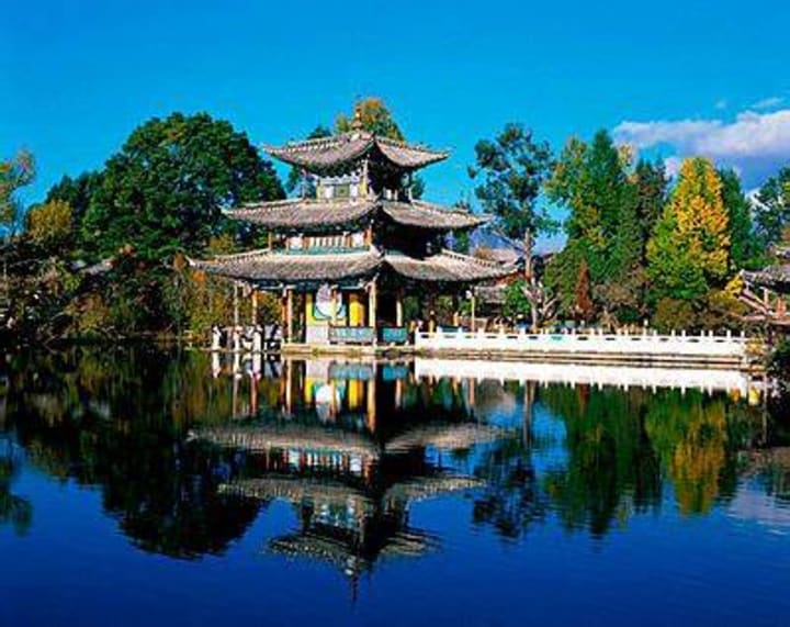 The front gate of the park is a grand decorated archway with a board inscribed with the name of the park. the Deyue Pavilion is located in the center of the Heilongtan Pool and is connected with the bank by a bridge. The pavilion has triple eaves and was built in 1876. It is used as a research institution for Dongba culture.
