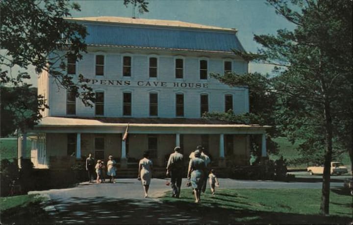See the Penn’s Cave House in Gregg Township. The highlight here is Penn’s Cave. The house is a private residence and office for tours of the property and cave. The complex is on the National Register of Historic Places.