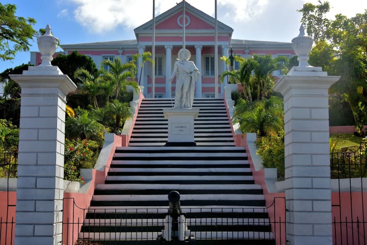 The Governor’s Mansion was built in 1801. It is a lovely conch-pink mansion that sits on top of Mount Fitzwilliam and is the official residence of the Governor General of the Bahamas. It is constructed of stone and supported by ionic columns. At the entrance stands a statue of Christopher Columbus. Visitors can walk about the complex, enjoying the views of the bay and Paradise Island. Twice a month there is a changing of the guard ceremony.