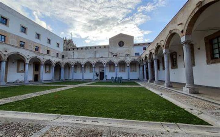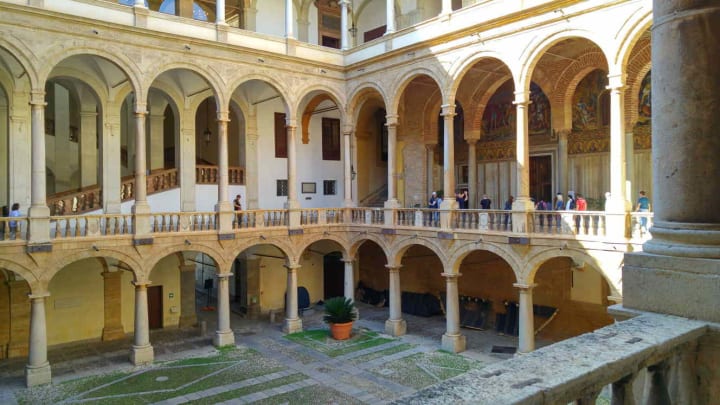 Cortile Maqueda is a square courtyard constructed in 1600. It is surrounded by three stories of arcades with rounded arches.
