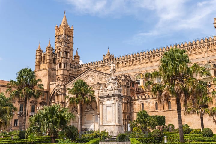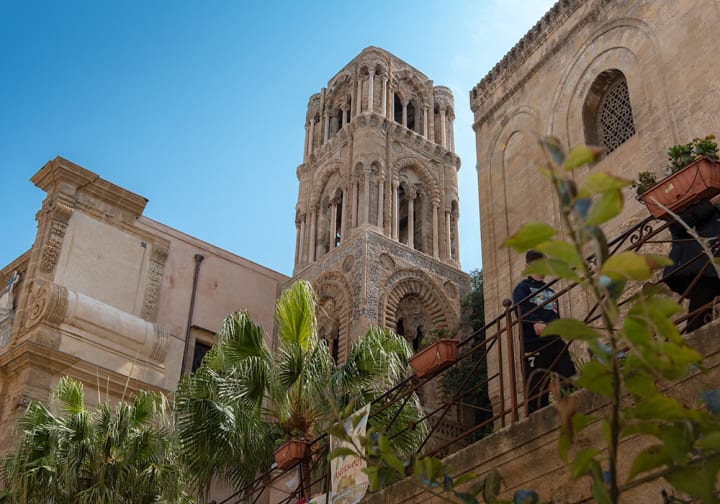 The Palermo Cathedral on Piazza del Catedrale has three apses, cross-over round arches, and curved parapets. Its 1453 Gothic-Catalan portico on the south side facing the square is impressive.