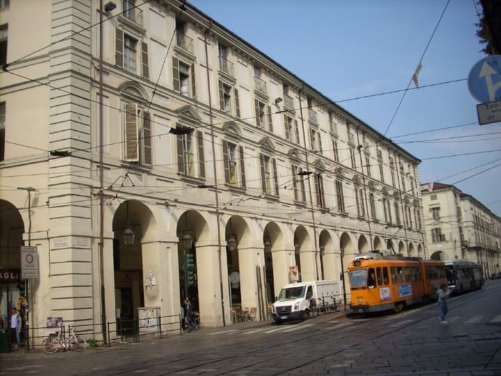 The Piazza San Carlo is surrounded by arcaded buildings. Beneath the arcades are stylish shops and historic cafes. In the center of the square is the equestrian statue of Duke Emmanuel Philibert.