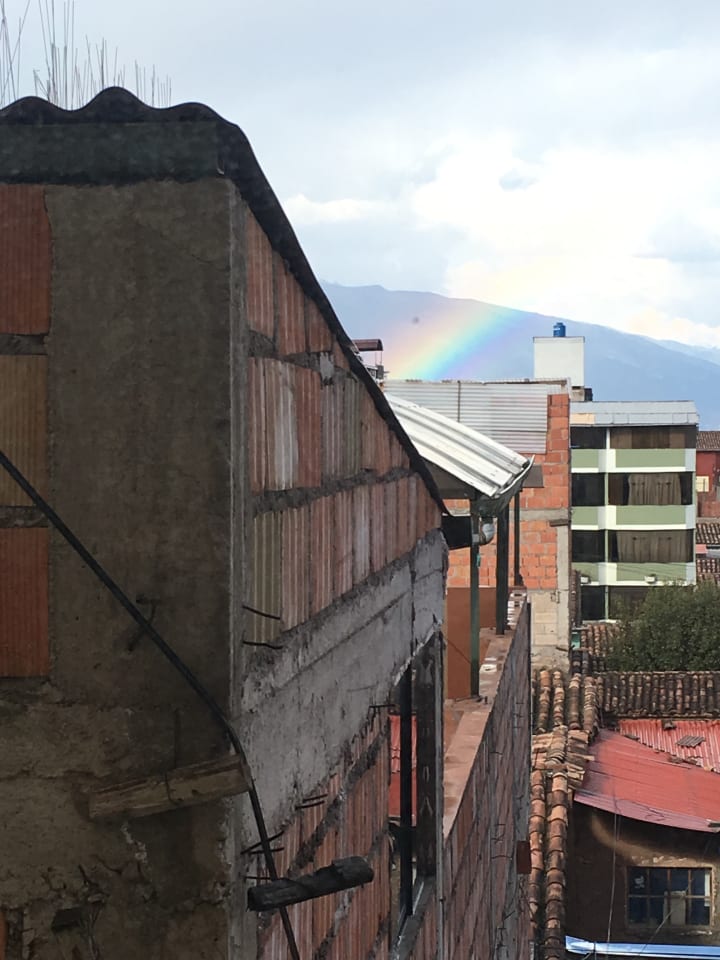 At some point, around the second week of my stay, my lungs adjusted to the altitude. Or maybe I adjusted to not breathing as easily as I did at my sea-level college apartment in San Luis Obispo, California. Either way, my chest felt lighter. After a particularly loud afternoon thunderstorm, the clouds parted and the sun started to shine. Call me overly sentimental, but a brilliant rainbow sparkled in the distance, and I felt peace. A hummingbird came to hover, right next to my window, and I had never seen anything so beautiful. I was too caught up in the moment to get a picture of the hummingbird, but I did get one of the rainbow.